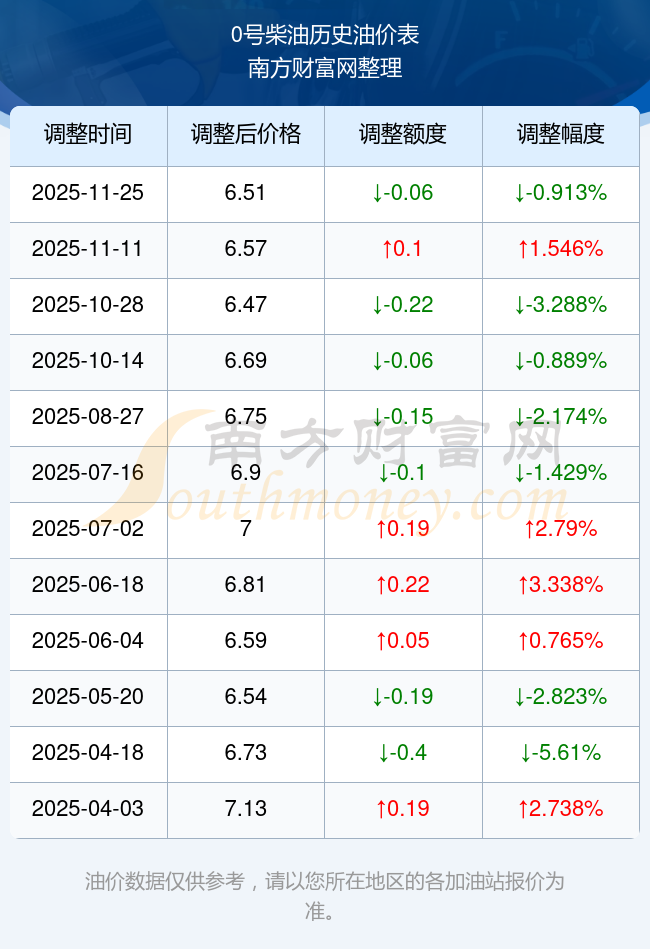 11月29日,汽油、柴油每升的價格為11月25日調整后的價格,具體為:92號汽油為6.89元,降了0.06元,降幅達0.86%;95號汽油為7.38元,降了0.06元,降幅達0.81%;0號柴油為6.51元,降了0.06元,降幅達0.91%。