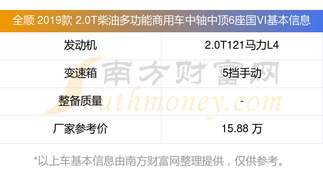 全順 2019款 2.0T柴油多功能商用車(chē)中軸中頂6座國(guó)VI動(dòng)力上配備的是一臺(tái)2.0T121馬力L4渦輪增壓發(fā)動(dòng)機(jī),匹配的是5擋手動(dòng)擋變速箱,燃料形式為柴油,廠家參考價(jià)15.88萬(wàn)元。