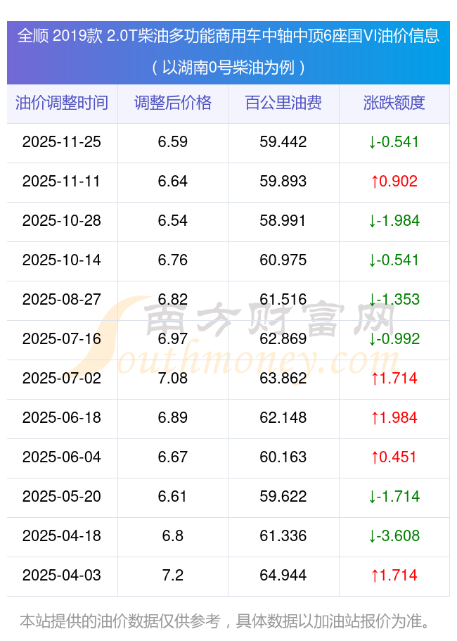 按11月25日0號(hào)柴油最新調(diào)整價(jià)格6.59元每升來(lái)計(jì)算(以湖南為例),該車(chē)型百公里平均油費(fèi)為59.442元,按上一輪11月11日調(diào)整價(jià)格6.64元每升來(lái)計(jì)算,百公里平均油費(fèi)為59.893元,對(duì)比上一輪少花0.541元,下一輪油價(jià)調(diào)整時(shí)間為12月8日24時(shí)。