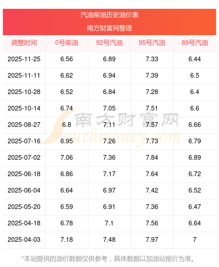2025年95號汽油價格一覽表