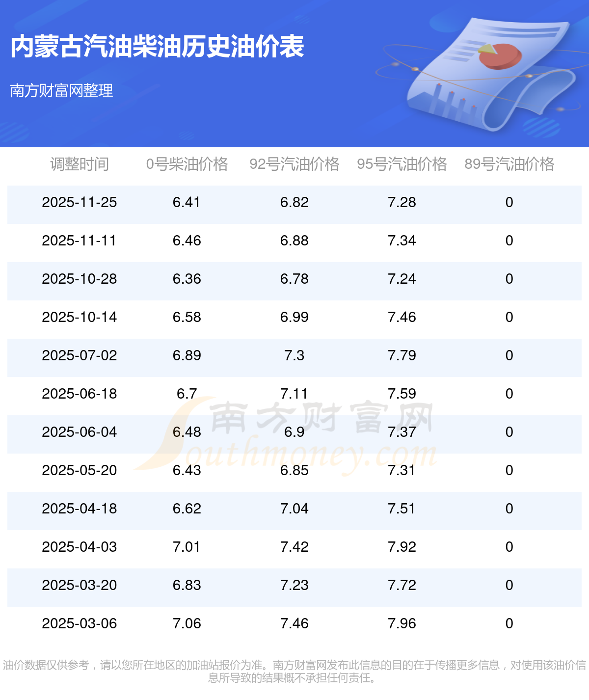 11月29日,內(nèi)蒙古95號汽油的價格是7.28元每升,本次的調(diào)整時間為11月25日,對比上次的調(diào)整跌了0.06元,跌0.817%,下次調(diào)整時間為12月8日24時,還有9.11天。