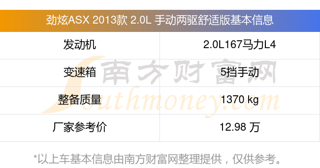 勁炫ASX 2013款 2.0L 手動(dòng)兩驅(qū)舒適版動(dòng)力上搭載的是一臺(tái)2.0L167馬力L4自然吸氣發(fā)動(dòng)機(jī),匹配5擋手動(dòng)擋變速箱,燃料形式為汽油,常規(guī)整備質(zhì)量1370kg,廠家參考價(jià)12.98萬元。
