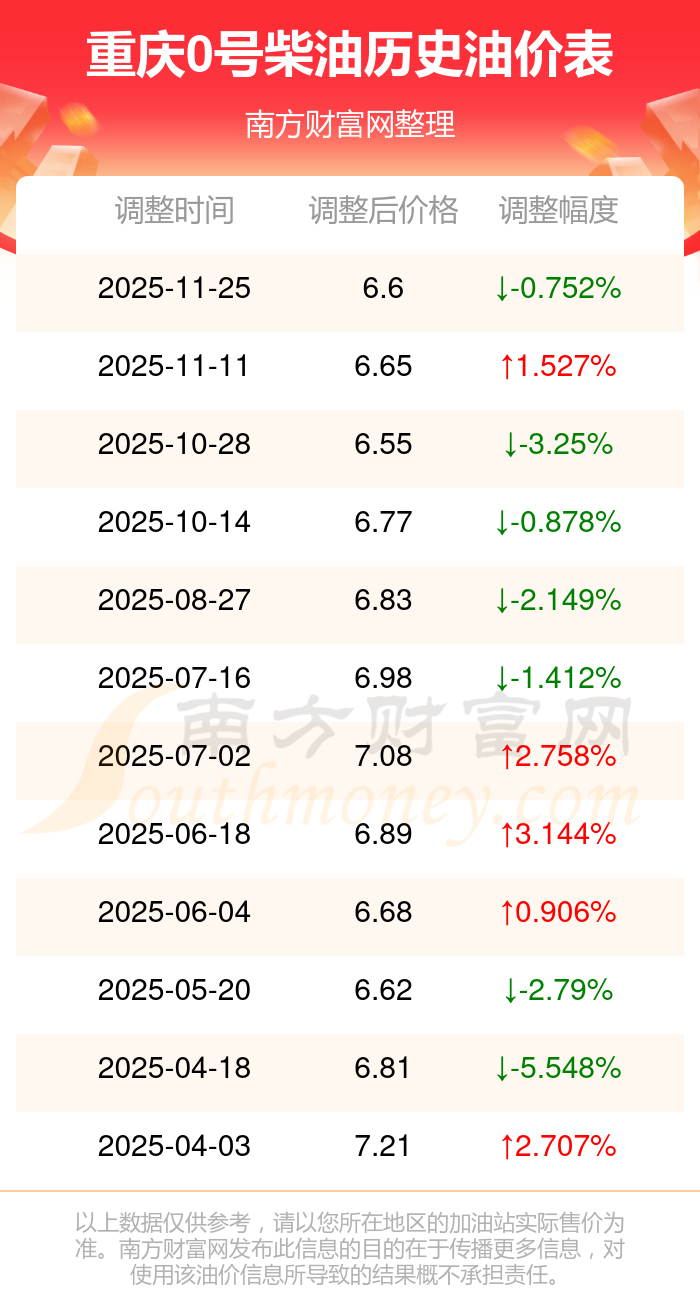 11月29日,重慶0號柴油的價格是6.6元每升,本次的調整時間為11月25日,對比上次的調整下跌了0.05元,下跌0.752%,12月8日24時為下一輪油價調整時間,還有9.08天。