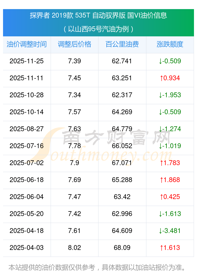按照11月25日95號汽油最新調(diào)整價格7.39元/升來計算(以山西為例),該車型百公里平均油費為62.741元,按照上一輪11月11日調(diào)整價格7.45元/升來計算,百公里平均油費為63.251元,對比上一輪少花0.509元,下一輪油價調(diào)整時間為12月8日24時。