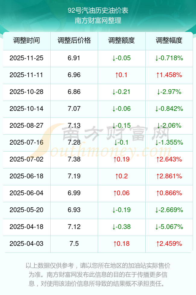 11月29日汽油、柴油的價格是11月25日調(diào)整后的價格,每升價格為:92號汽油為6.91元,下降了0.05元,下降幅達0.72%;95號汽油為7.48元,下降了0.06元,下降幅達0.8%;89號汽油為6.41元,下降了0.05元,下降幅達0.77%;0號柴油為6.53元,下降了0.06元,下降幅達0.91%。下一輪油價調(diào)整時間12月8日24時,距離現(xiàn)在還有9.07天。