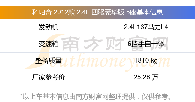 在動(dòng)力方面,科帕奇 2012款 2.4L 四驅(qū)豪華版 5座搭載的是一臺2.4L167馬力L4自然吸氣發(fā)動(dòng)機(jī),匹配6擋手自一體自動(dòng)檔變速箱,燃料形式為汽油,常規(guī)整備質(zhì)量1810kg,廠家參考價(jià)25.28萬元。