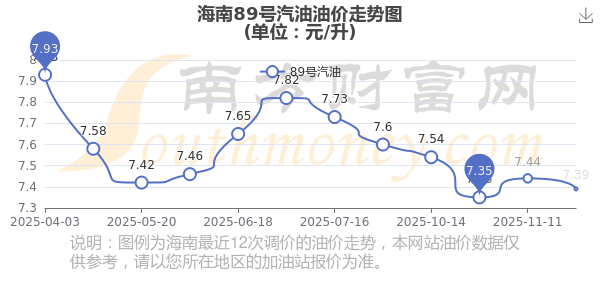 11月30日,海南89號汽油的價格是7.39元每升,本次的調(diào)整時間為11月25日,對比上次的調(diào)整降了0.05元,降0.672%,下次調(diào)整時間為12月8日24時,還有8.9天。