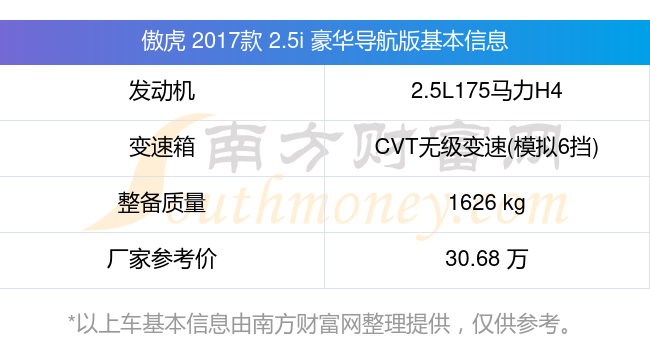 傲虎 2017款 2.5i 豪華導航版動力方面,搭載的是一臺2.5L175馬力H4自然吸氣發(fā)動機,匹配CVT無級變速(模擬6擋)自動檔變速箱,燃料形式為汽油,常規(guī)整備質(zhì)量1626kg,廠家參考價30.68萬元。