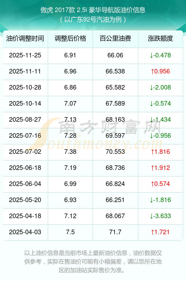按照11月25日92號汽油最新調(diào)整價格6.91元/升來計算(以廣東為例),該車型百公里平均油費為66.06元,按照上一輪11月11日調(diào)整價格6.96元/升來計算,百公里平均油費為66.538元,對比上一輪少花0.478元,下一輪油價調(diào)整時間為12月8日24時。