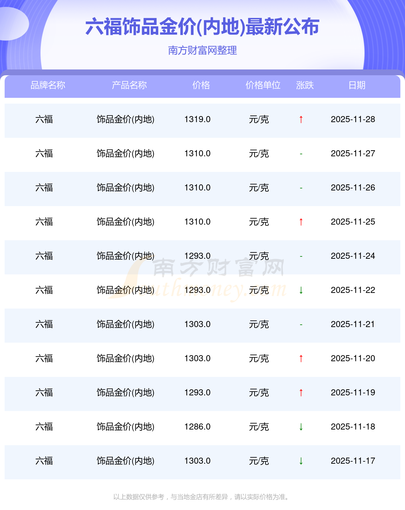 今日六福飾品金價(jià)(內(nèi)地)為1319.0元/克。