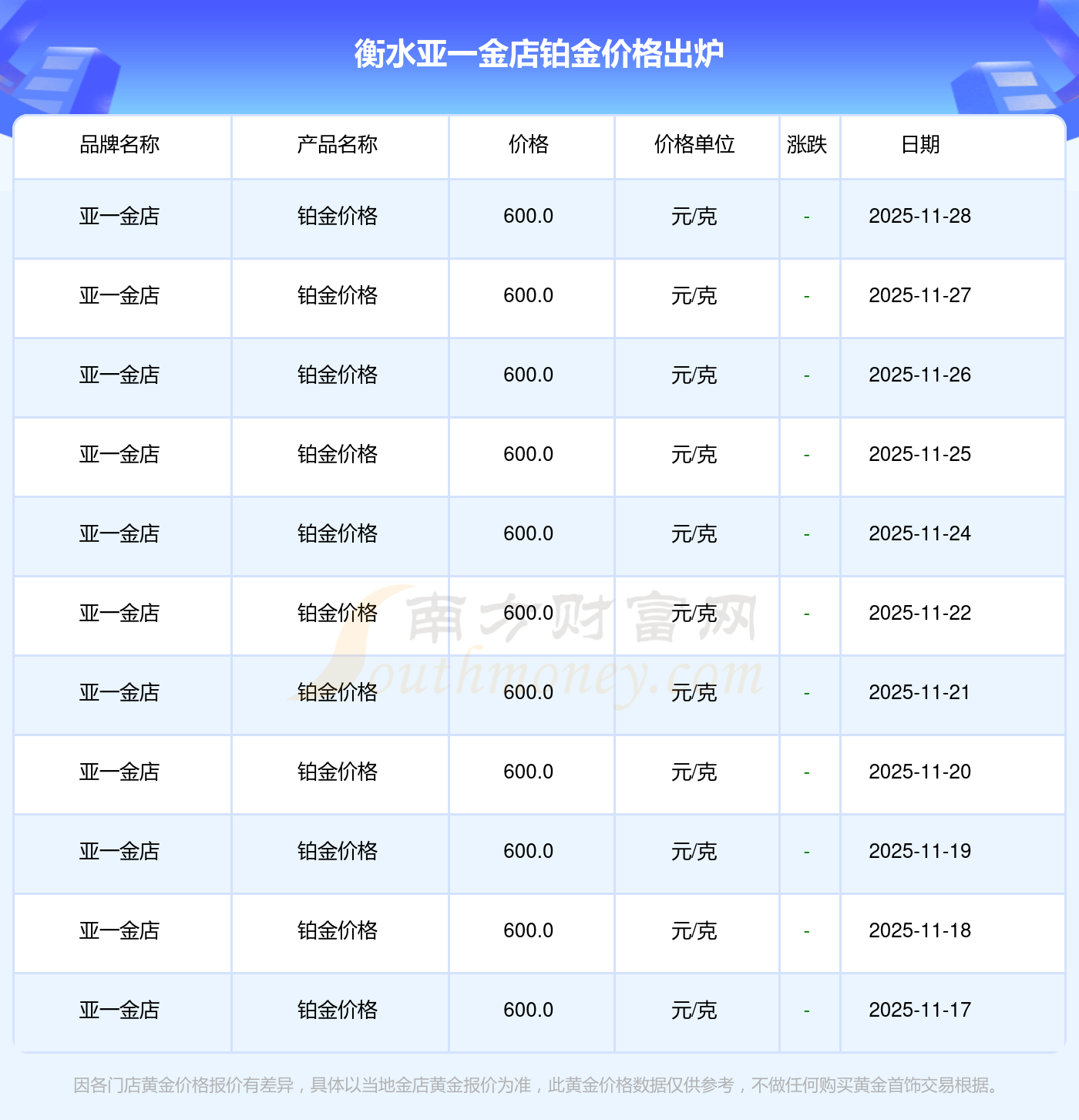 2025年11月30日衡水亞一金店鉑金價格:600.0元/克。