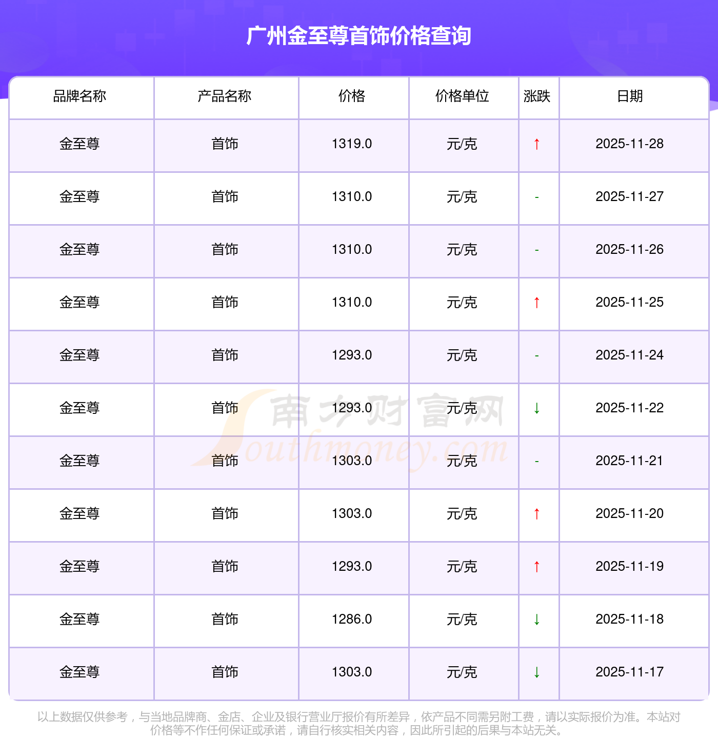 2025年11月30日,廣州金至尊的首飾標(biāo)價(jià)達(dá)到 1319.0元/克。