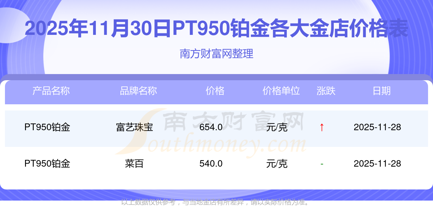 今天是2025年11月30日,星光達(dá)珠寶、星光達(dá)珠寶、寶泉錢(qián)幣、金蘭首飾、金蘭首飾、謝瑞麟、謝瑞麟、謝瑞麟、謝瑞麟、謝瑞麟、金銀街等各大金店品牌PT950鉑金最新價(jià)格如下:星光達(dá)珠寶1321.0元/克、星光達(dá)珠寶600.0元/克、寶泉錢(qián)幣12.6元/克、金蘭首飾1321.0元/克、金蘭首飾600.0元/克、謝瑞麟1207.0元/克、謝瑞麟1321.0元/克、謝瑞麟46370.0、謝瑞麟13970.0、謝瑞麟41860.0、金銀街1296.0元/克。