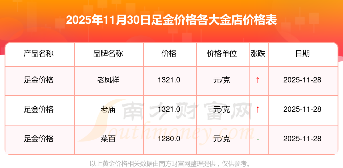 2025年11月30日星光達珠寶、星光達珠寶、寶泉錢幣、金蘭首飾、金蘭首飾、謝瑞麟、謝瑞麟、謝瑞麟、謝瑞麟、謝瑞麟、金銀街等各大金店品牌足金價格最新價格如下:星光達珠寶黃金價格1321.0元/克,星光達珠寶鉑金價格600.0元/克,寶泉錢幣銀條價格12.6元/克,金蘭首飾黃金價格1321.0元/克,金蘭首飾鉑金價格600.0元/克,謝瑞麟金條價格(內(nèi)地)1207.0元/克,謝瑞麟金飾價格(內(nèi)地)1321.0元/克,謝瑞麟黃金飾品(香港)46370.0,謝瑞麟鉑金飾品(香港)13970.0,謝瑞麟金條金價(香港)41860.0,金銀街投資金條1296.0元/克。