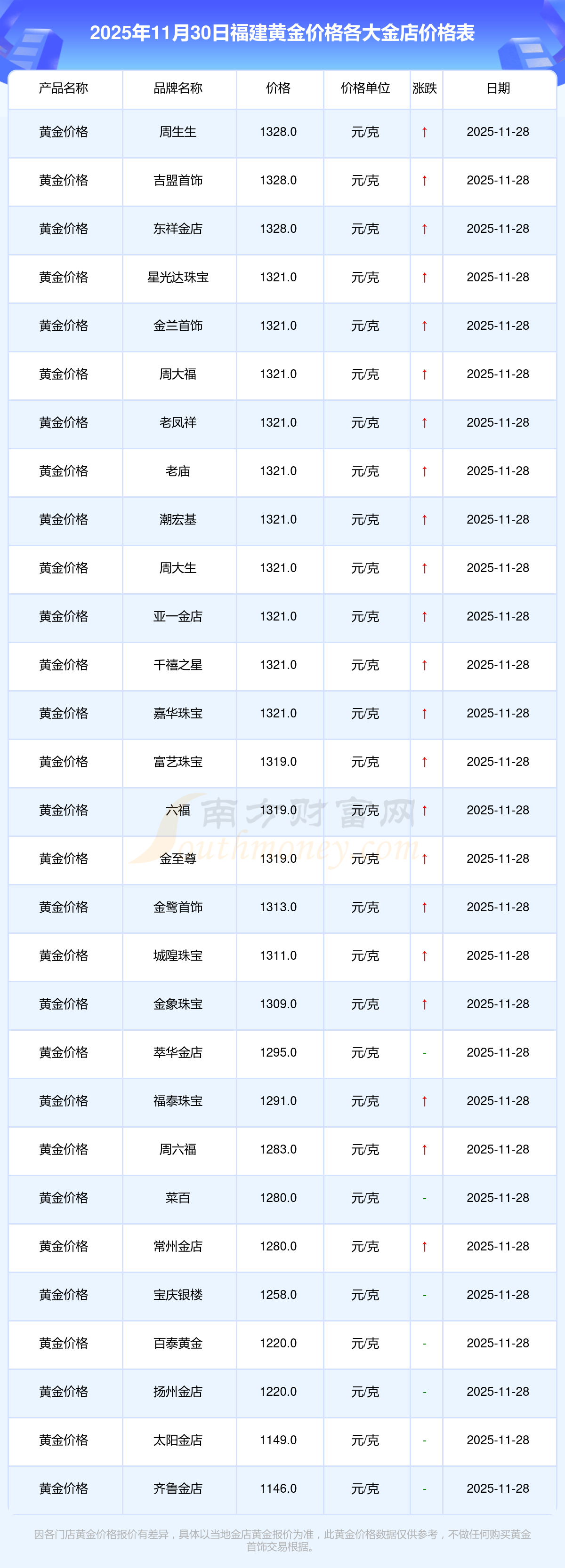 2025年11月30日福建各大金店黃金價格最新價格:星光達珠寶1321.0元/克,星光達珠寶600.0元/克,寶泉錢幣12.6元/克,金蘭首飾1321.0元/克,金蘭首飾600.0元/克,謝瑞麟1207.0元/克,謝瑞麟1321.0元/克,謝瑞麟46370.0,謝瑞麟13970.0,謝瑞麟41860.0,金銀街1296.0元/克。
