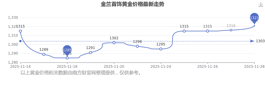 今日(2025年11月30日)金蘭首飾黃金價格為1321.0元/克。