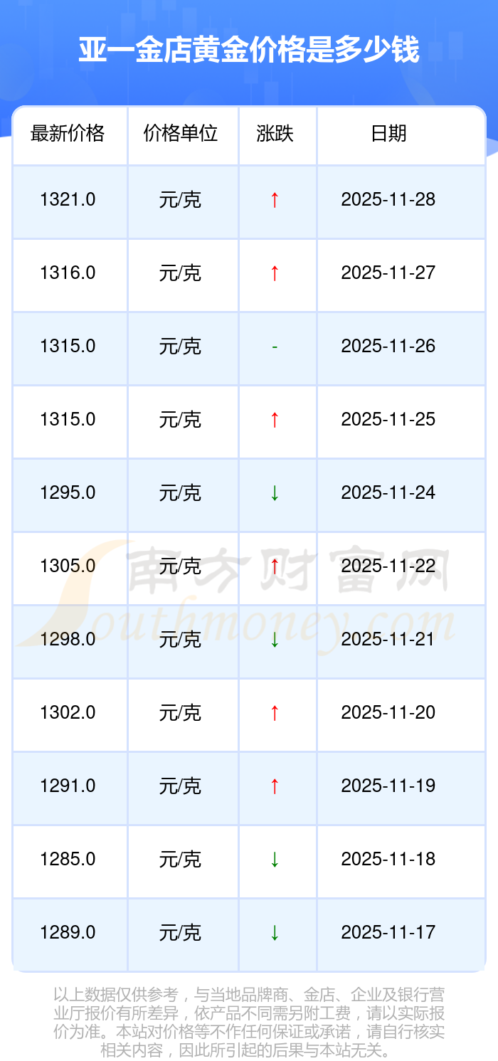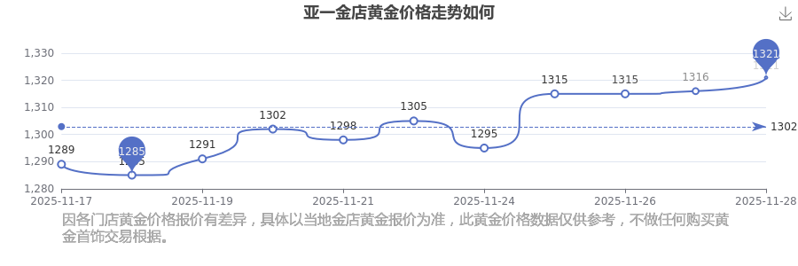 今天黃金價格幾何?現(xiàn)在每克黃金值多少錢?黃金是優(yōu)良的導電導熱材料,具備良好的導熱特性。因其化學穩(wěn)定性高、抗氧化性強,可用來制作高精度電子元件,所以在電子工業(yè)的特殊電路設(shè)計中經(jīng)常被使用。今日(2025年11月30日)亞一金店黃金價格是1321.0元/克。