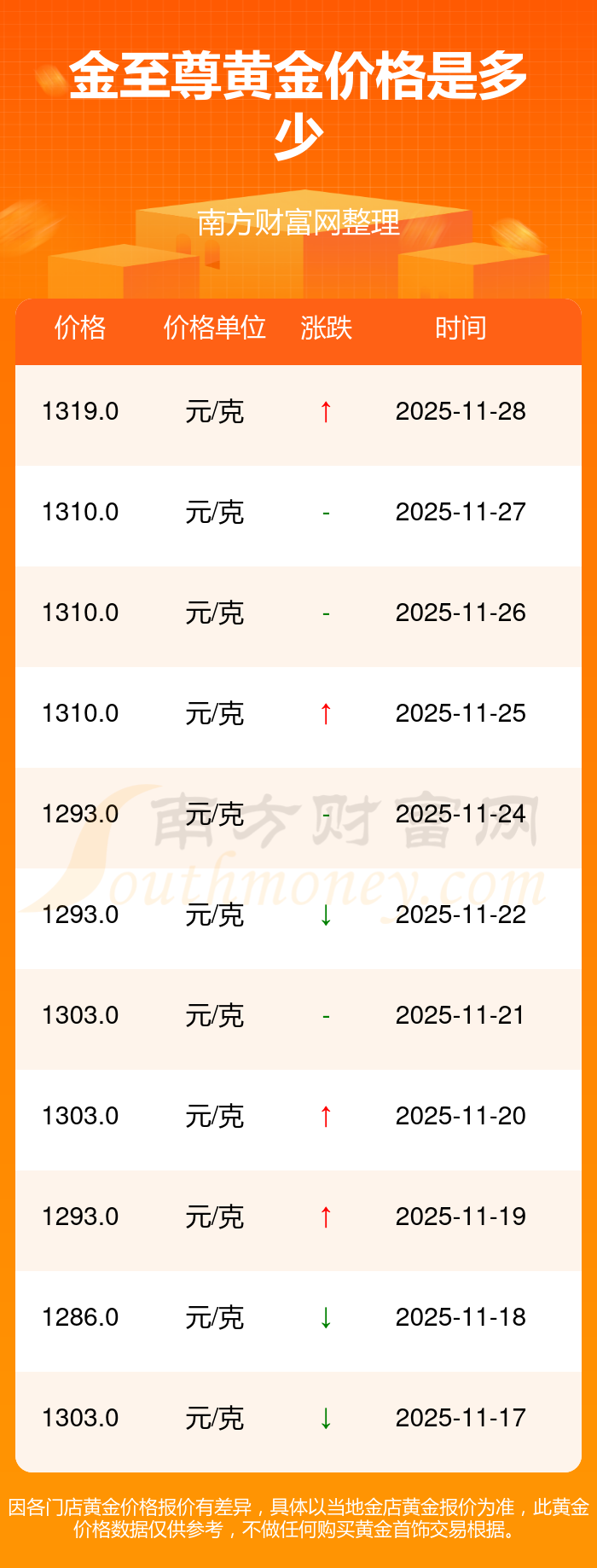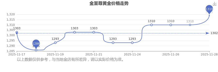 今日金至尊 黃金價格最新的克重售價為1319.0元/克。