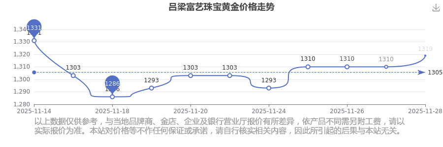 2025年11月30日,呂梁富藝珠寶所售黃金價格,其價格設(shè)定為 1319.0元/克。