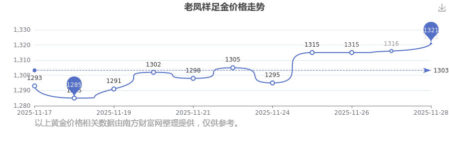 老鳳祥 足金價格在今日的最新價格顯示為1321.0元/克。