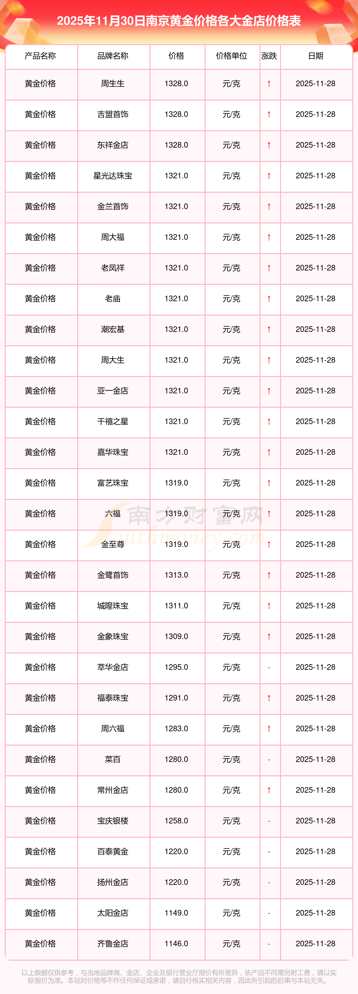 今天是2025年11月30日,南京星光達(dá)珠寶、星光達(dá)珠寶、寶泉錢幣、金蘭首飾、金蘭首飾、謝瑞麟、謝瑞麟、謝瑞麟、謝瑞麟、謝瑞麟、金銀街等各大金店品牌黃金價(jià)格最新價(jià)格如下:星光達(dá)珠寶1321.0元/克、星光達(dá)珠寶600.0元/克、寶泉錢幣12.6元/克、金蘭首飾1321.0元/克、金蘭首飾600.0元/克、謝瑞麟1207.0元/克、謝瑞麟1321.0元/克、謝瑞麟46370.0、謝瑞麟13970.0、謝瑞麟41860.0、金銀街1296.0元/克。