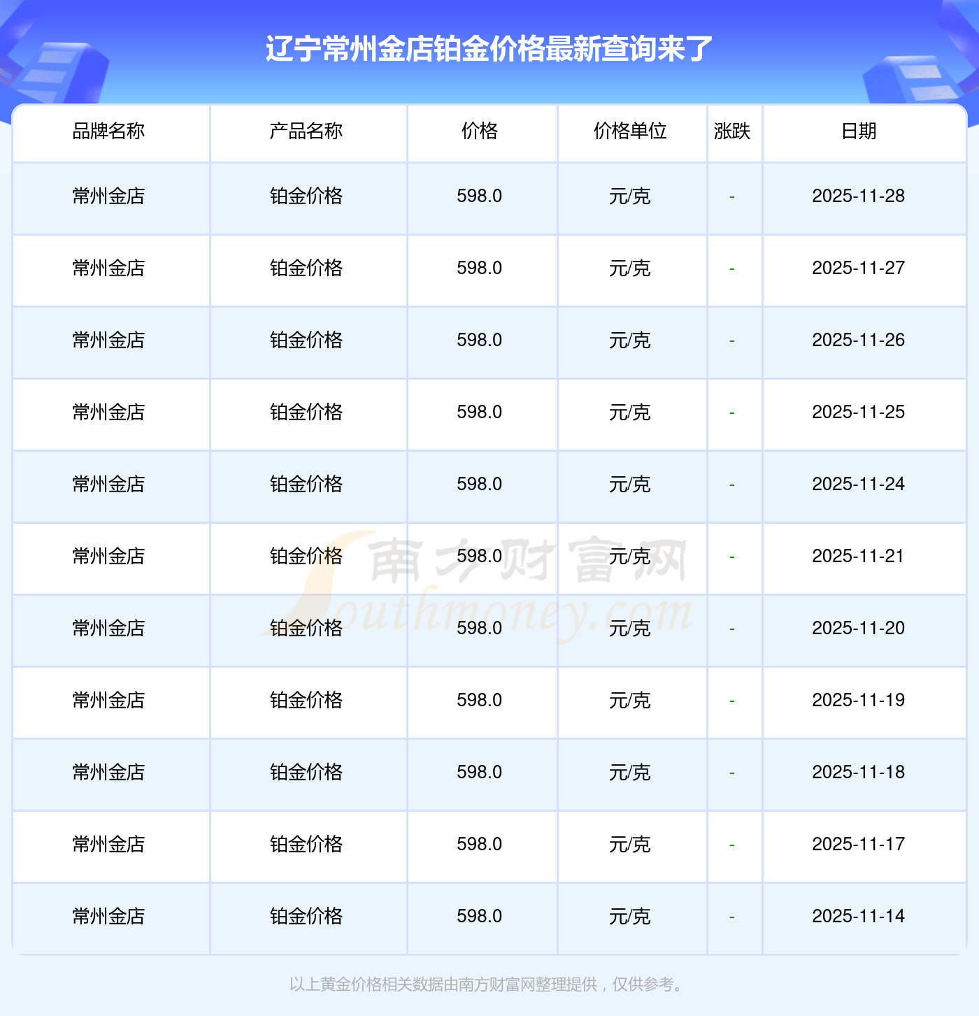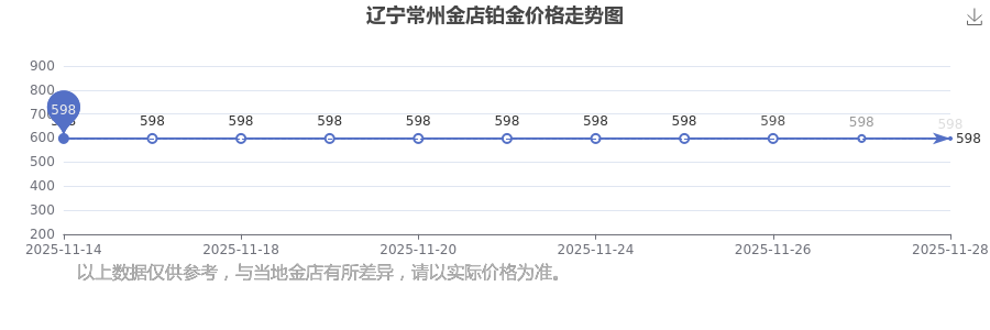 2025年11月30日,遼寧常州金店鉑金價(jià)格每克的售賣價(jià)位為598.0元/克。