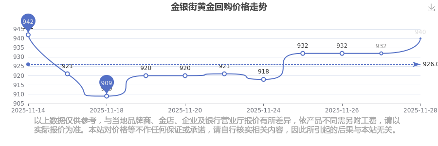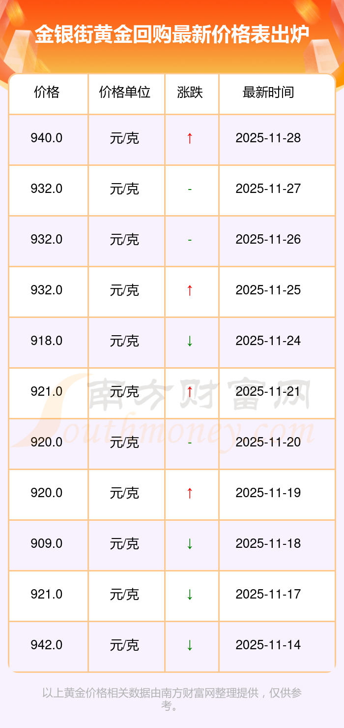 當(dāng)下,金銀街 黃金回購今日的最新價格是940.0元/克。