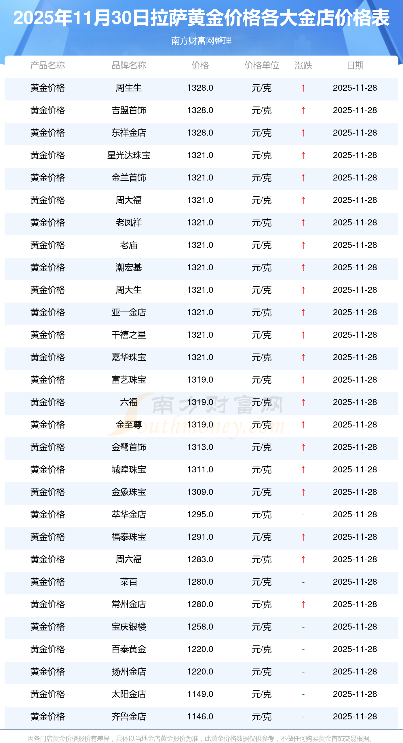 2025年11月30日,拉薩星光達(dá)珠寶、星光達(dá)珠寶、寶泉錢幣、金蘭首飾、金蘭首飾、謝瑞麟、謝瑞麟、謝瑞麟、謝瑞麟、謝瑞麟、金銀街等各大金店品牌黃金價(jià)格今日價(jià)格行情最新來(lái)了:星光達(dá)珠寶1321.0元/克、星光達(dá)珠寶600.0元/克、寶泉錢幣12.6元/克、金蘭首飾1321.0元/克、金蘭首飾600.0元/克、謝瑞麟1207.0元/克、謝瑞麟1321.0元/克、謝瑞麟46370.0、謝瑞麟13970.0、謝瑞麟41860.0、金銀街1296.0元/克。