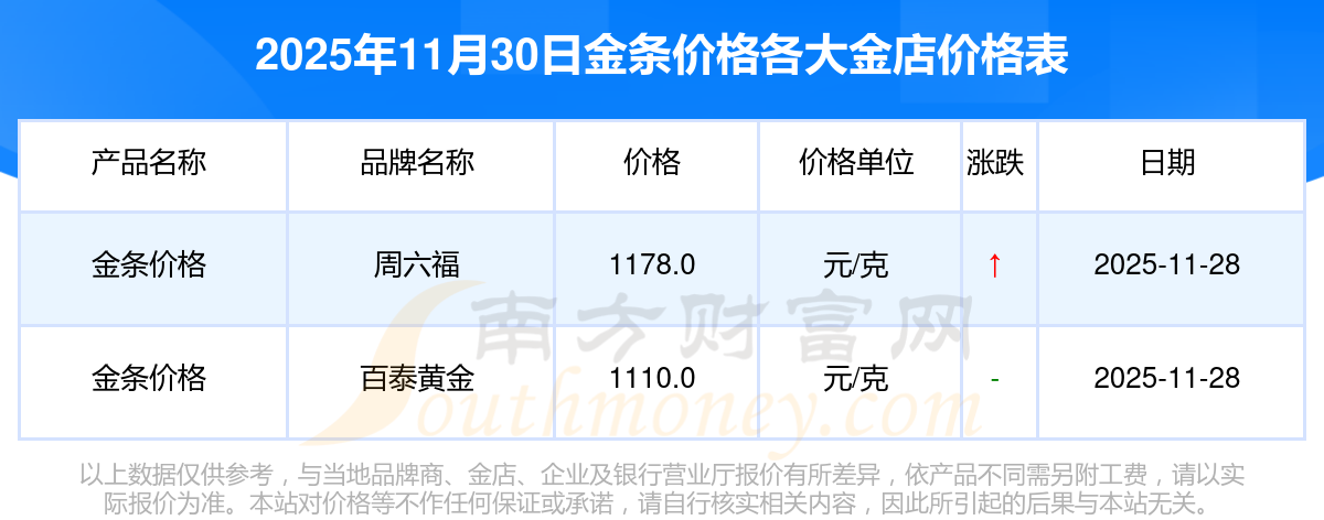 2025年11月30日,星光達珠寶、星光達珠寶、寶泉錢幣、金蘭首飾、金蘭首飾、謝瑞麟、謝瑞麟、謝瑞麟、謝瑞麟、謝瑞麟、金銀街等各大金店品牌金條價格今日價格如下:星光達珠寶1321.0元/克、星光達珠寶600.0元/克、寶泉錢幣12.6元/克、金蘭首飾1321.0元/克、金蘭首飾600.0元/克、謝瑞麟1207.0元/克、謝瑞麟1321.0元/克、謝瑞麟46370.0、謝瑞麟13970.0、謝瑞麟41860.0、金銀街1296.0元/克。