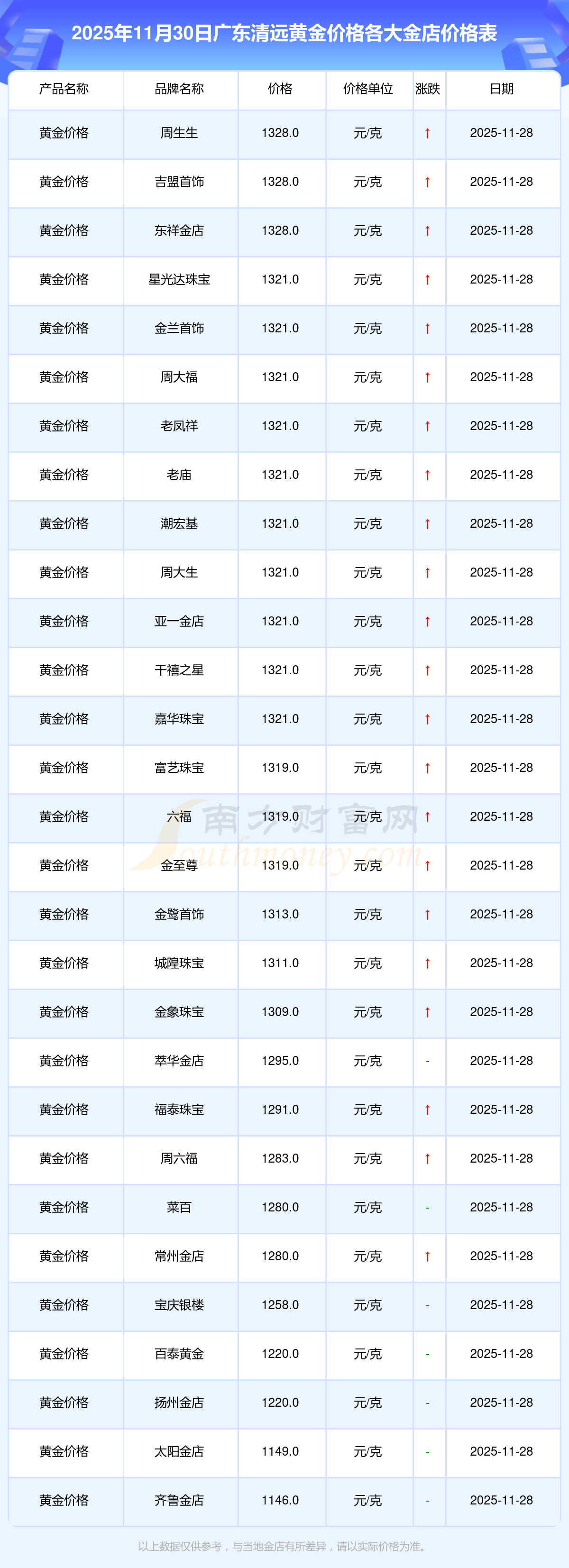 廣東清遠(yuǎn)各大金店黃金價格實時行情,廣東清遠(yuǎn)各大金店黃金價格表今日多少一克(2025年11月30日)