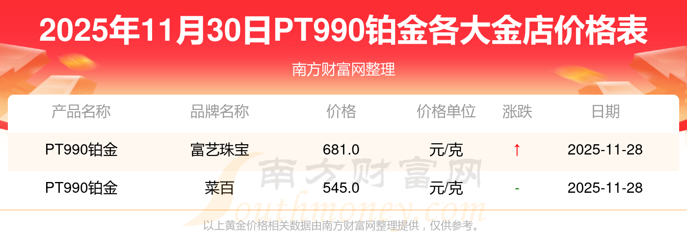各大金店P(guān)T990鉑金價格最新公布了,2025年11月30日各大金店P(guān)T990鉑金價格多少錢一克
