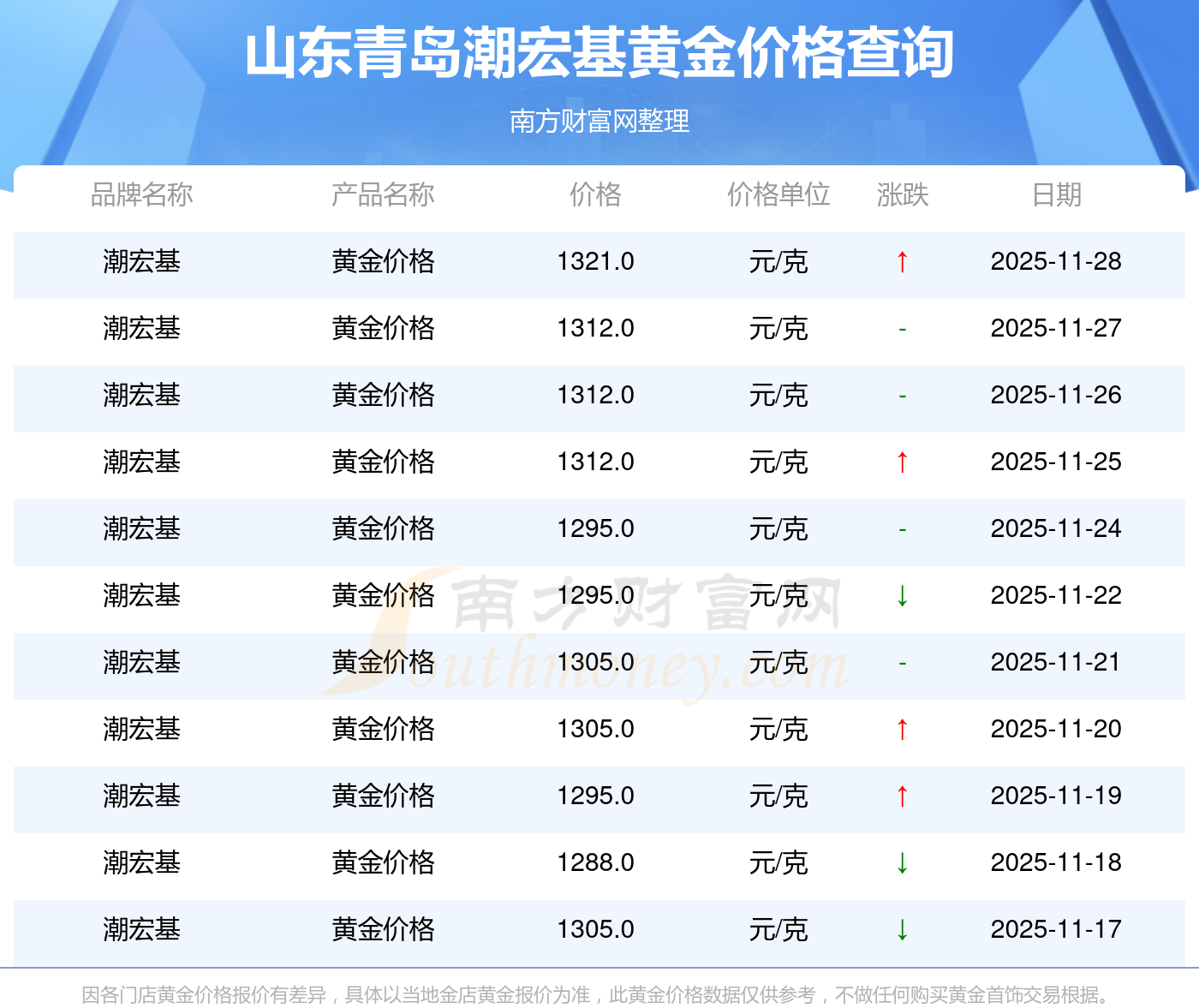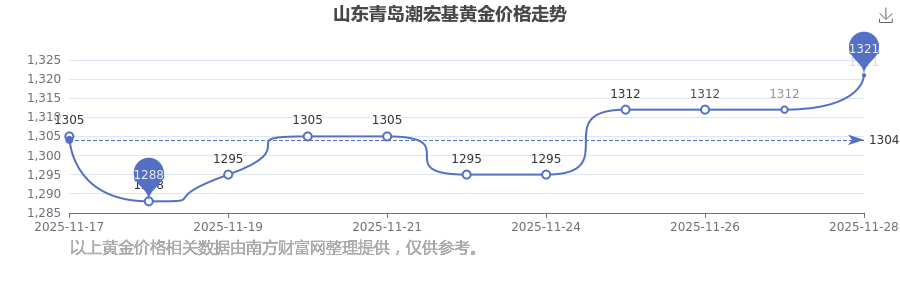 今日(2025年11月30日)山東青島潮宏基黃金價格:1321.0元/克。