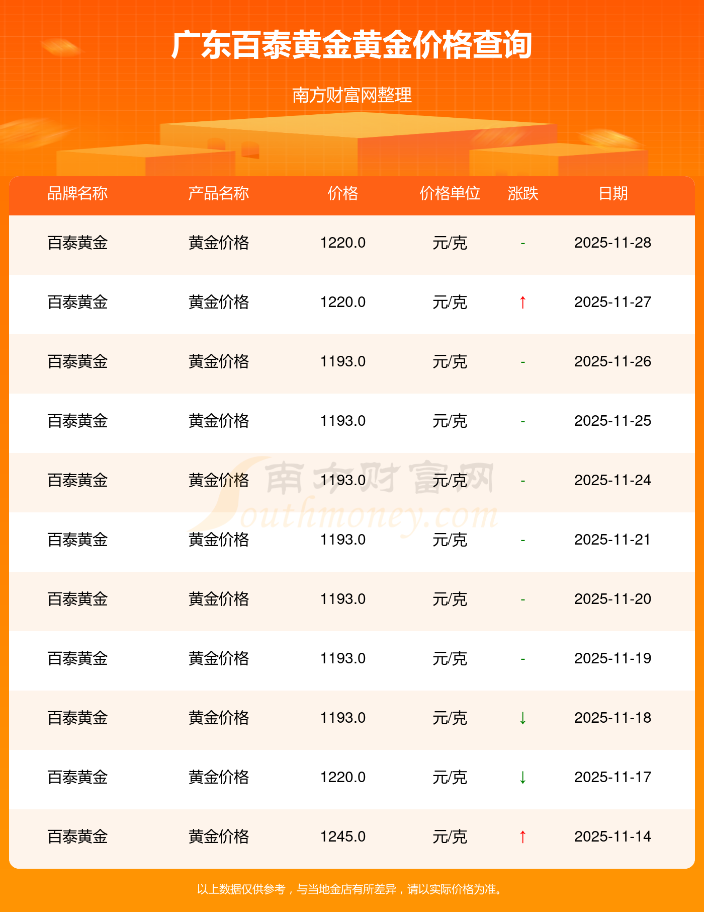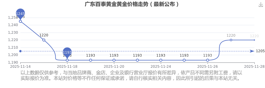 廣東百泰黃金 2025年11月30日的黃金價(jià)格價(jià)位為 1220.0元/克。
