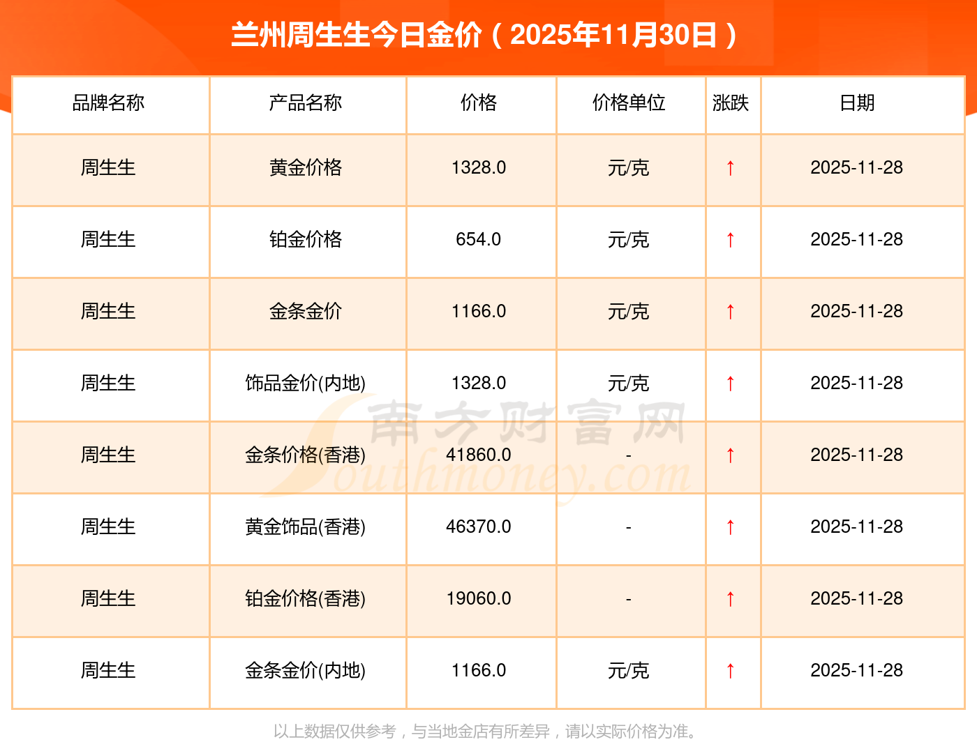 2025年11月30日蘭州周生生今日價(jià)格:黃金價(jià)格1321.0元/克,鉑金價(jià)格600.0元/克,銀條價(jià)格12.6元/克,黃金價(jià)格1321.0元/克,鉑金價(jià)格600.0元/克,金條價(jià)格(內(nèi)地)1207.0元/克,金飾價(jià)格(內(nèi)地)1321.0元/克,黃金飾品(香港)46370.0,鉑金飾品(香港)13970.0,金條金價(jià)(香港)41860.0,投資金條1296.0元/克。