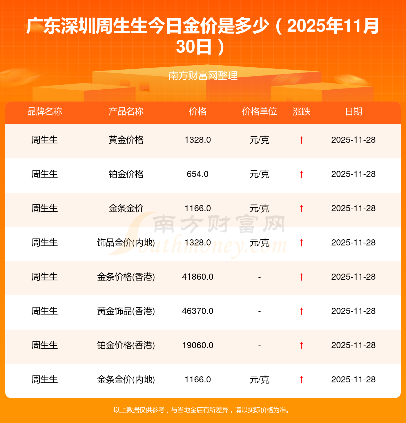 2025年11月30日廣東深圳周生生今日價格:黃金價格1321.0元/克,鉑金價格600.0元/克,銀條價格12.6元/克,黃金價格1321.0元/克,鉑金價格600.0元/克,金條價格(內(nèi)地)1207.0元/克,金飾價格(內(nèi)地)1321.0元/克,黃金飾品(香港)46370.0,鉑金飾品(香港)13970.0,金條金價(香港)41860.0,投資金條1296.0元/克。