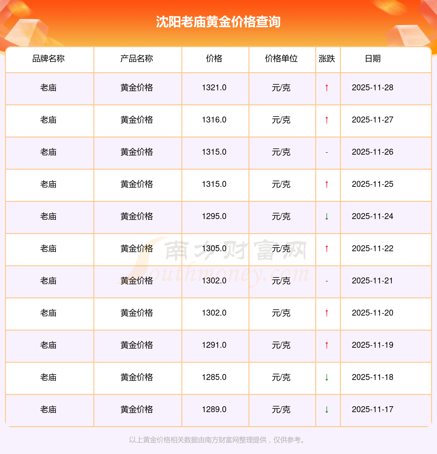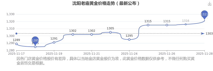今日(2025年11月30日)沈陽老廟黃金價格:1321.0元/克。