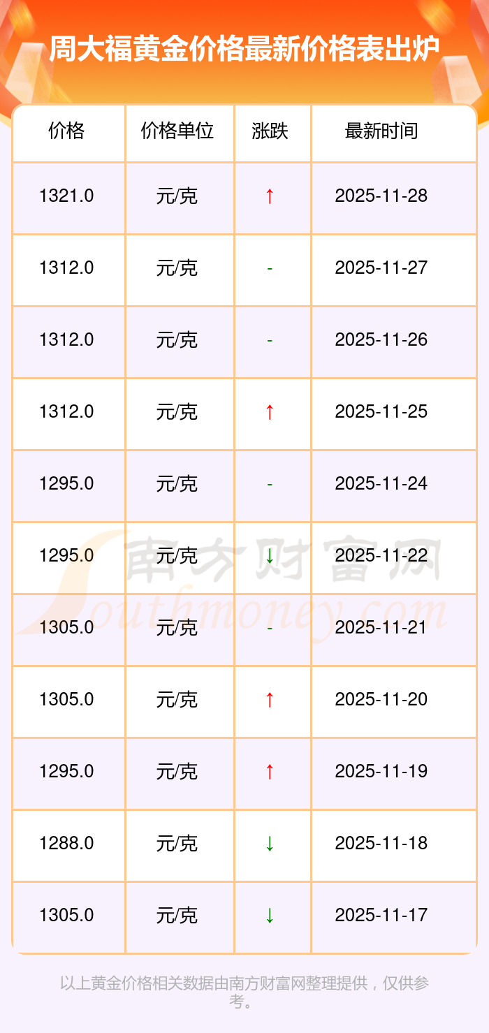 今日(2025年11月30日),周大福黃金價格:1321.0元/克。