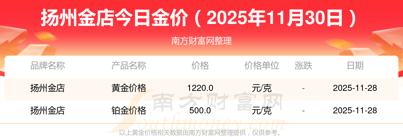 2025年11月30日揚(yáng)州金店最新價(jià)格:黃金價(jià)格1321.0元/克,鉑金價(jià)格600.0元/克,銀條價(jià)格12.6元/克,黃金價(jià)格1321.0元/克,鉑金價(jià)格600.0元/克,金條價(jià)格(內(nèi)地)1207.0元/克,金飾價(jià)格(內(nèi)地)1321.0元/克,黃金飾品(香港)46370.0,鉑金飾品(香港)13970.0,金條金價(jià)(香港)41860.0,投資金條1296.0元/克。