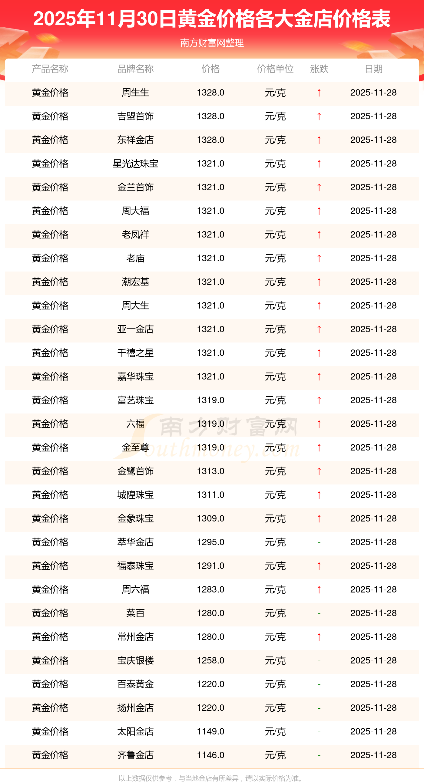 2025年11月30日,星光達珠寶、星光達珠寶、寶泉錢幣、金蘭首飾、金蘭首飾、謝瑞麟、謝瑞麟、謝瑞麟、謝瑞麟、謝瑞麟、金銀街等各大金店品牌黃金價格今日價格如下:星光達珠寶1321.0元/克、星光達珠寶600.0元/克、寶泉錢幣12.6元/克、金蘭首飾1321.0元/克、金蘭首飾600.0元/克、謝瑞麟1207.0元/克、謝瑞麟1321.0元/克、謝瑞麟46370.0、謝瑞麟13970.0、謝瑞麟41860.0、金銀街1296.0元/克。
