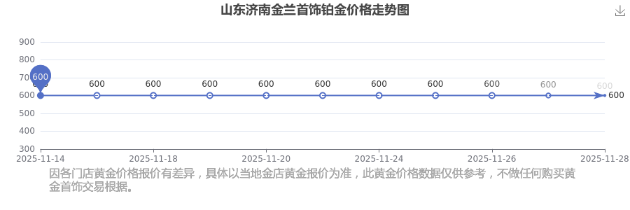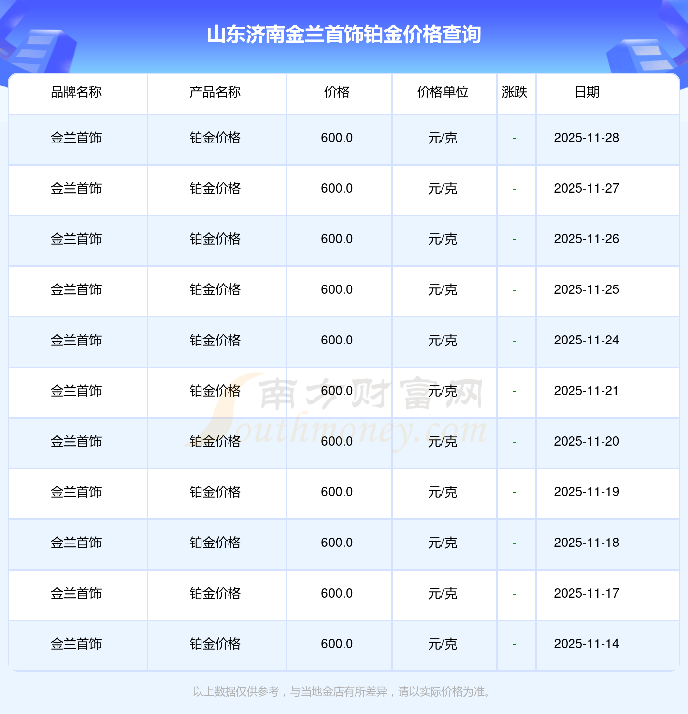 今日(2025年11月30日),山東濟(jì)南金蘭首飾鉑金價(jià)格每克的價(jià)值為600.0元/克。