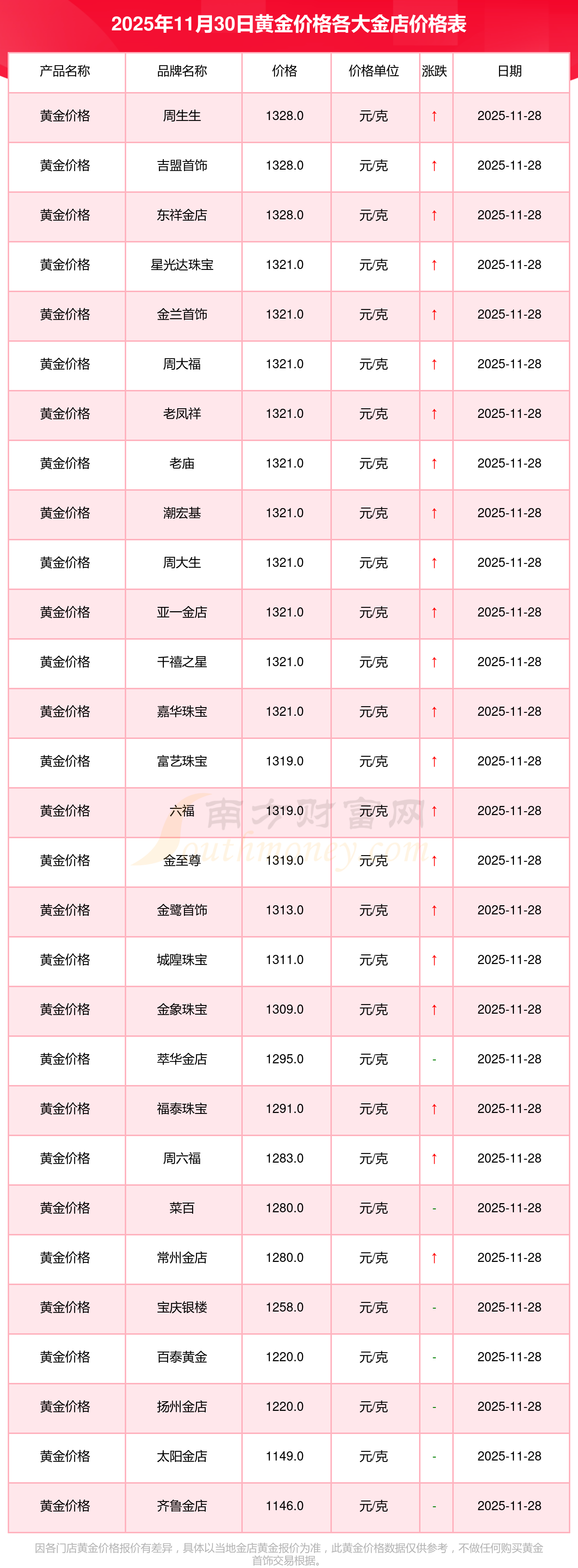2025年11月30日,星光達(dá)珠寶、星光達(dá)珠寶、寶泉錢幣、金蘭首飾、金蘭首飾、謝瑞麟、謝瑞麟、謝瑞麟、謝瑞麟、謝瑞麟、金銀街等各大金店品牌黃金價(jià)格今日價(jià)格如下:星光達(dá)珠寶1321.0元/克、星光達(dá)珠寶600.0元/克、寶泉錢幣12.6元/克、金蘭首飾1321.0元/克、金蘭首飾600.0元/克、謝瑞麟1207.0元/克、謝瑞麟1321.0元/克、謝瑞麟46370.0、謝瑞麟13970.0、謝瑞麟41860.0、金銀街1296.0元/克。