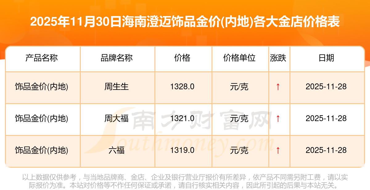 飾品金價(jià)(內(nèi)地)今日價(jià)格查詢表,海南澄邁各大金店飾品金價(jià)(內(nèi)地)多少錢一克?(2025年11月30日)