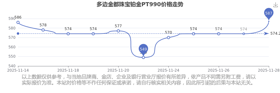 據(jù)了解,多邊金都珠寶今日鉑金PT990價格為587.0元/克。