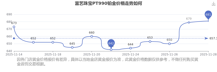 今日(2025年11月30日)富藝珠寶PT990鉑金價(jià)格:681.0元/克。